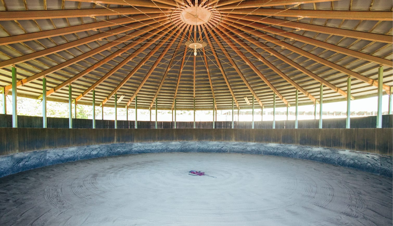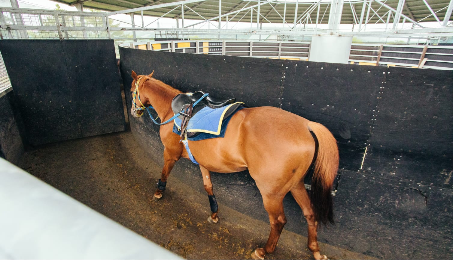 当場では坂路中心の調教になってくるので、 坂路調教に向けて角馬場で馬のバランスを修正し、